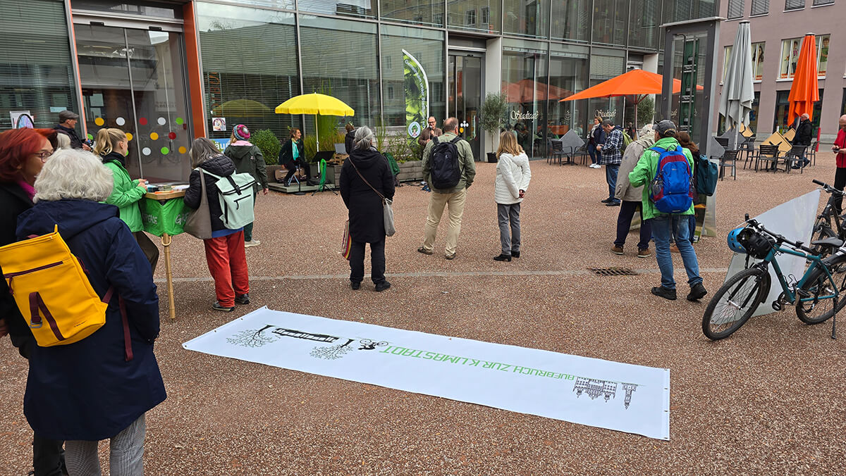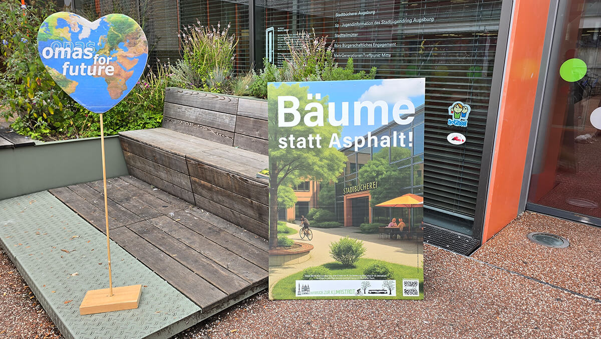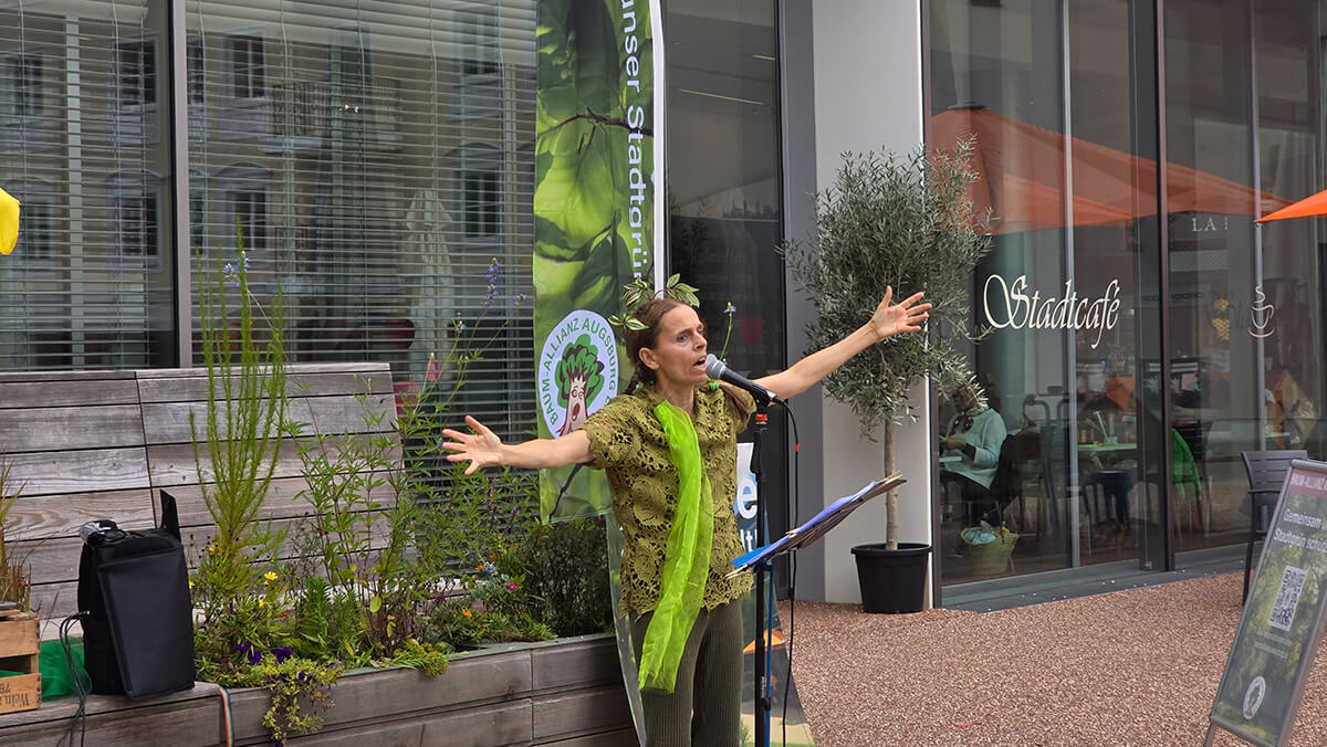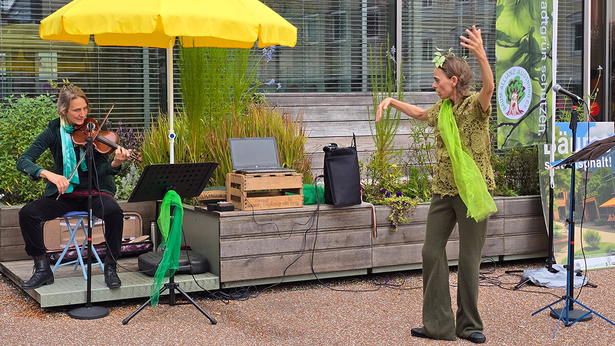 heute am Samstag, 27. September 2025 fand die zweite gemeinsame Veranstaltung mehrerer NGOs und Vereine (Attac, Baum-Allianz Augsburg, Greenpeace Augsburg, Öko-Sozial-Projekt, Omas for Future Augsburg, Parents for Future) „Aufbruch zur Kimastadt“ auf dem Vorplatz der Stadtbücherei statt. Etliche Besucher tauschten sich mit anregenden Gesprächen mit den verschiedenen Gruppen aus und nutzten die Veranstaltung um ihre Meinung zur Forderung nach mehr Grünflächen einzubringen. Künstlerisch umrahmt wurde die Veranstaltung durch das bekannte Klexs-Theater Augsburg. Sie präsentierten Auszüge aus ihrem Programm „Baumgeflüster“, einer Darbietung mit Gesang, Tanz und Live-Musik, die das Anliegen einer grüneren Stadt in den Mittelpunkt stellt.