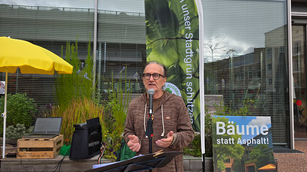 Unter dem Leitgedanken „Bäume statt Asphalt“ setzten sich die Umweltinitiativen für die Begrünung des stark versiegelten Platzes ein, der als einer der größten Hitze-Hotspots in Augsburg gilt. Mit der Aktion zeigten sie Schritte auf, wie Augsburg zur Klimastadt werden kann, und sendeten zugleich ein Signal gegen das unzureichende Handeln der Stadtpolitik.